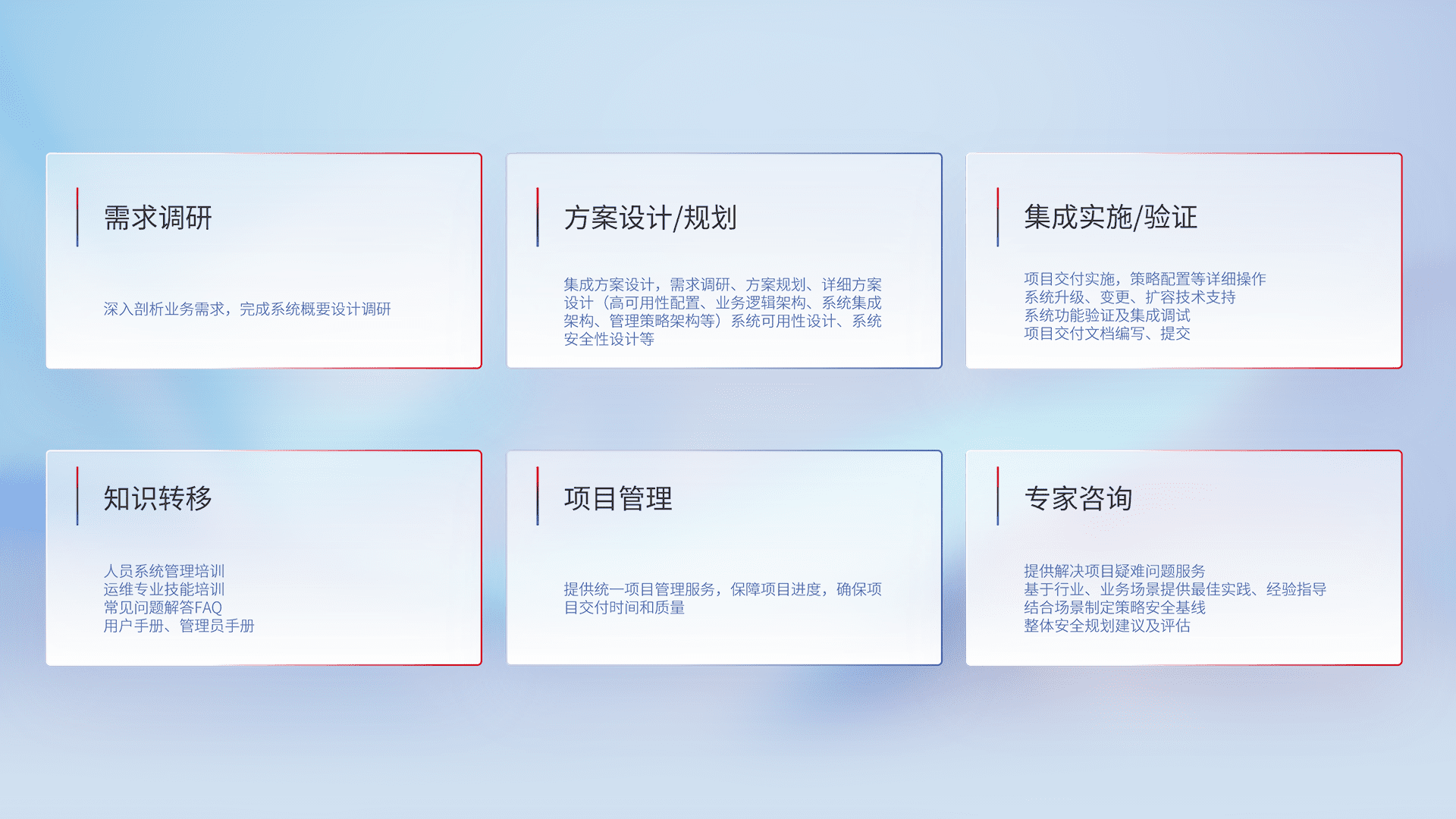 针对客户行业特性,,将宏观的安全战略和需求,,,通过专业的交付服务,,,实现项目落地,,为客户提供标准规范的集成交付服务。。。
